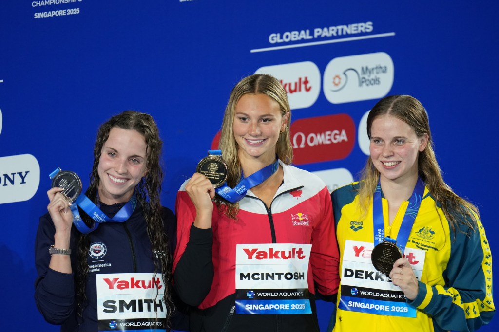 Summer McINTOSH (CAN) came close to setting a new world record in the women’s 200m butterfly, missing it by a mere 0.18 seconds. She finished with a time of 2 minutes 1.99 seconds, establishing a new Championship Record and earning her third gold medal in Singapore. Regan SMITH (USA) followed closely behind, finishing exactly three seconds later, with Elizabeth DEKKERS (AUS) in third place.
